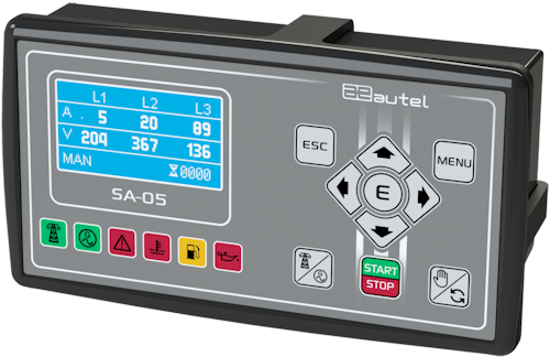 Простое и компактное решение для автоматической обработки генераторных установок и тепловых двигателей с монохромным ЖК-дисплеем. Он оснащен 10 кнопками для запуска/остановки и быстрого контроля основных функций, 6 яркими светодиодными сигналами, которые показывают аварии двигателя и статус системы, а также графическим дисплеем 128x64 пикселя монохромного черно-белого цвета с голубым подсветом, обеспечивающим отличную видимость и четкость. Этот контроллер измеряет до 2 трехфазных линий (частоту, активную мощность, реактивную мощность, видимую мощность, киловатт-час и угол сдвига фазы cosfi) и автоматически управляет сетевым обменом генератора и запуском генераторного агрегата. SA-05 также оборудован различными функциями, такими как управление обслуживанием двигателя, контроль и защита двигателя с автоматическим отключением и звуковым сигналом. Контроллер включает один порт RS232, один порт RS485 и одну линию CAN BUS в J1939 или CAN OPEN.