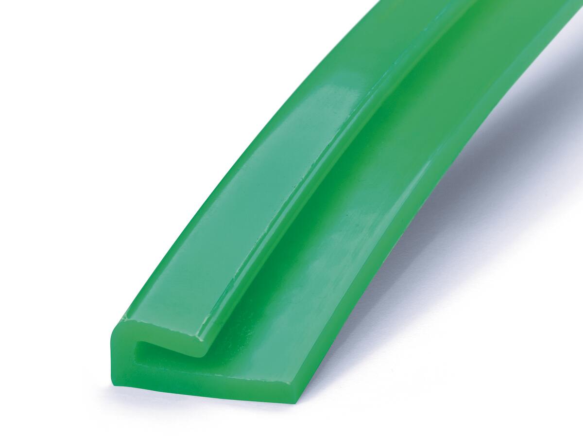 Профиль скольжения зеленого цвета предназначен для конвейерных систем, обеспечивая низкое трение и плавное движение. Он устойчив к износу и подходит для различных применений. Продукт помогает оптимизировать производительность оборудования.