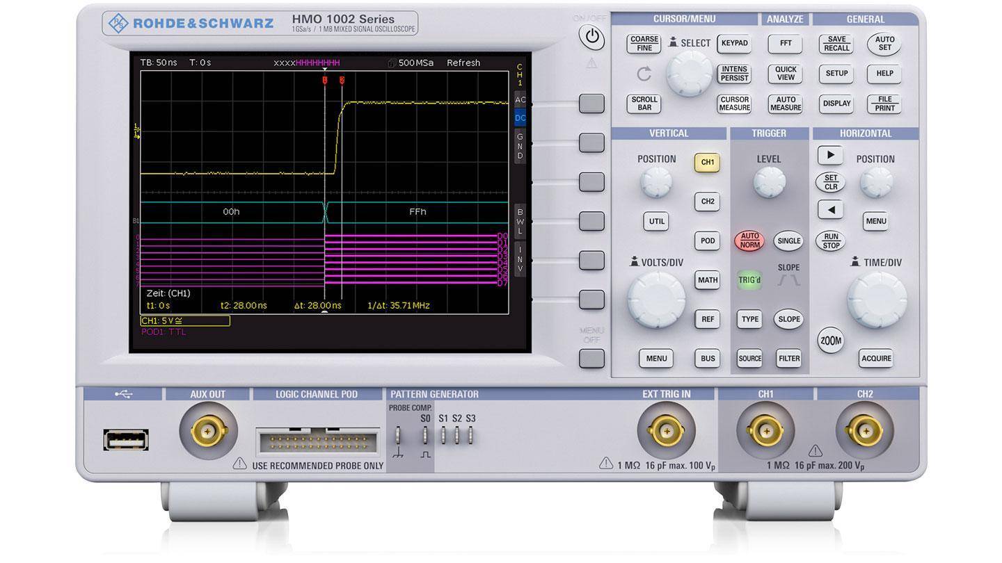 Двухканальный осциллограф R&S®HMO1002 с полосой пропускания от 50 МГц до 100 МГц.